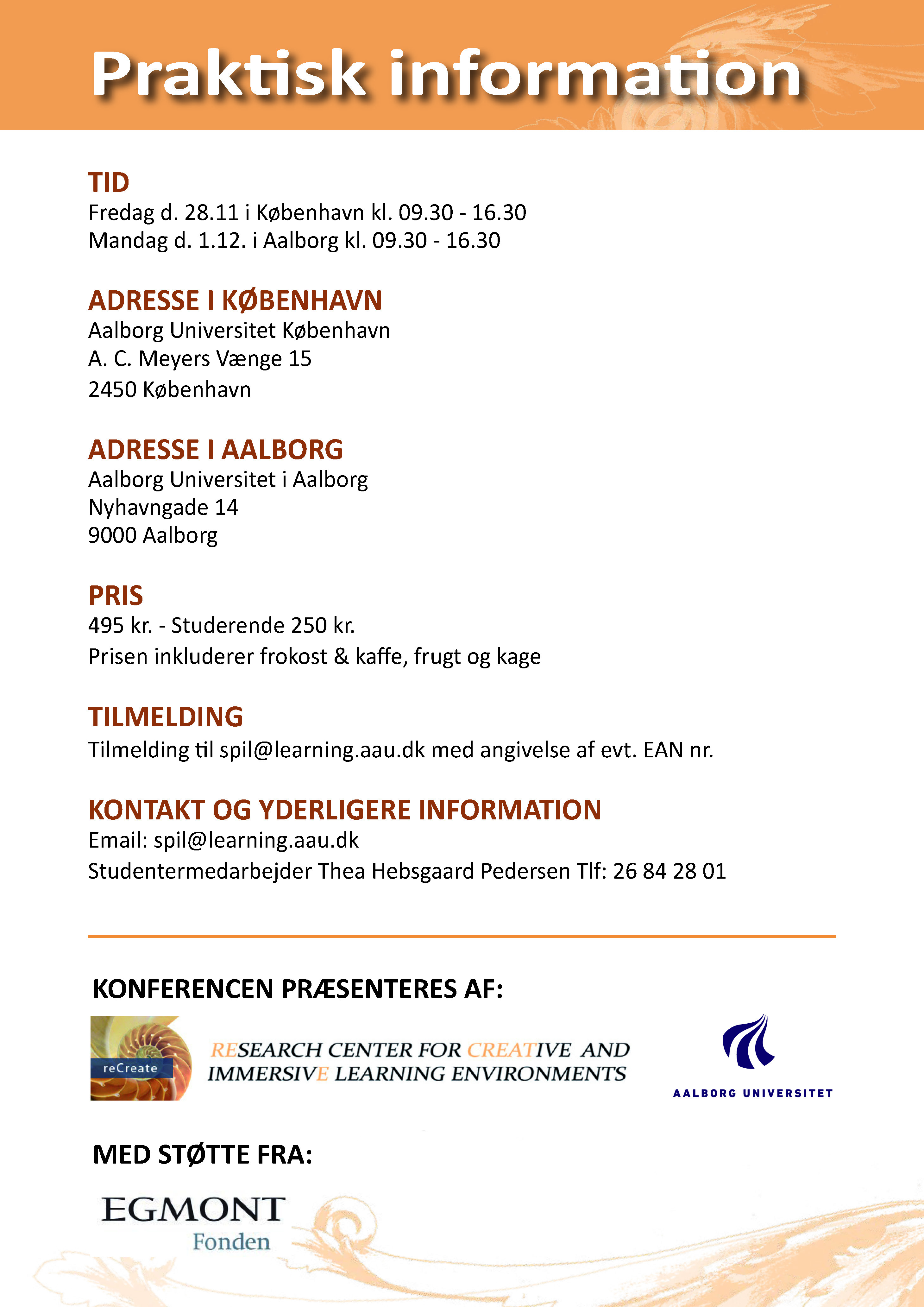 Der er begrænset deltagerantal, snarlig tilmelding tilrådes inden 22.11 til spil@learning.aau.dk med angivelse af konferencedato, navn, adresse, e-mail, tlf. evt. organisation og EAN nr.